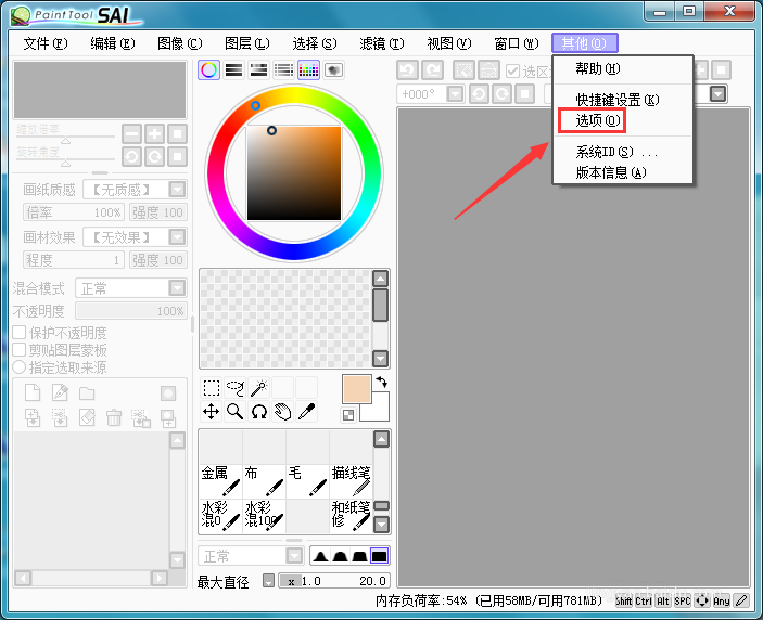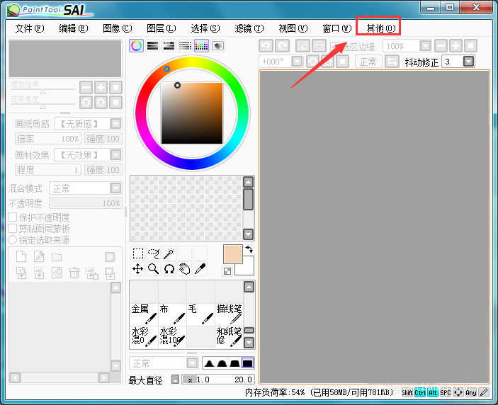2、打开sai之后在菜单里找到其他选项,如图所示: