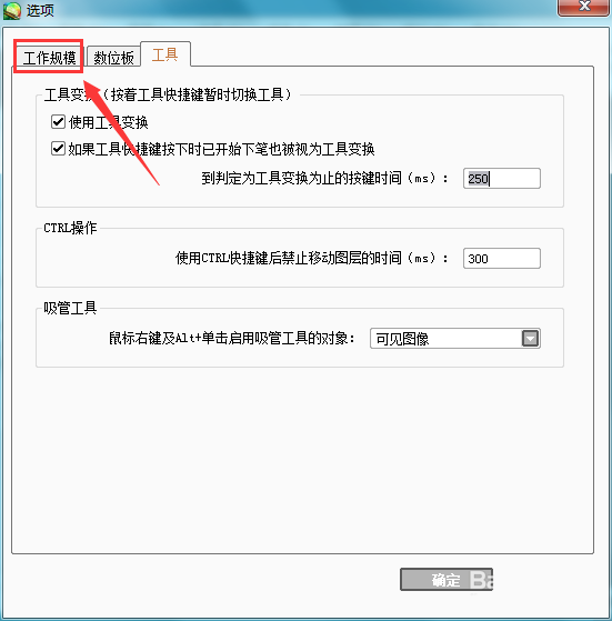 4、点击选项在弹出的对话框内找到工作规模选项,如图所示: