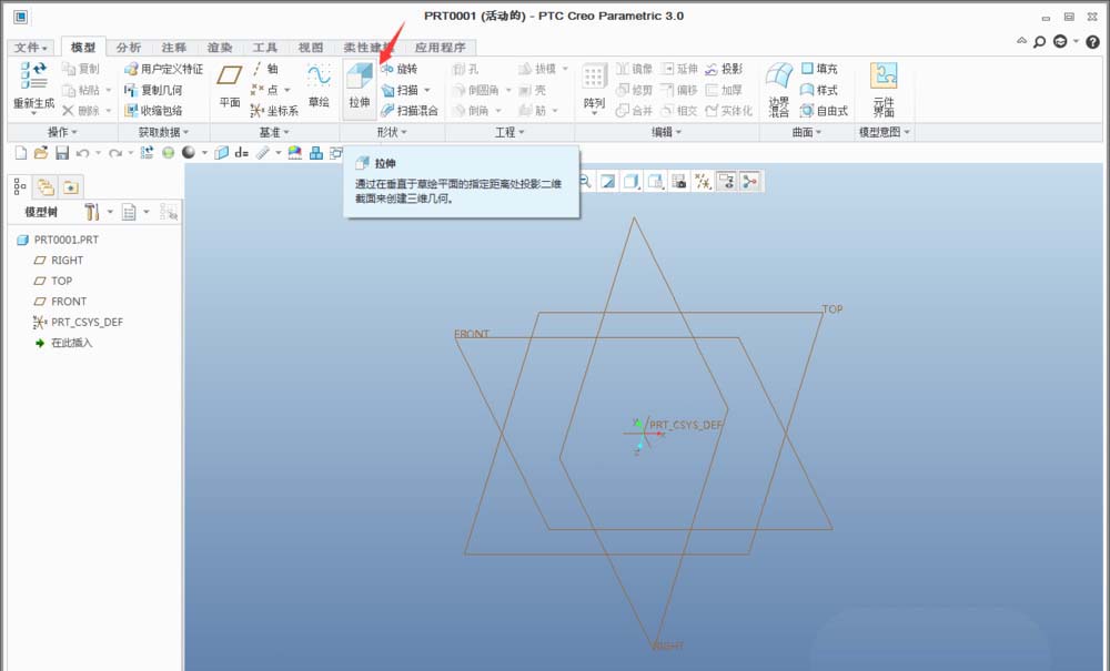 3、点击模型区的“拉伸”功能,进行曲面拉伸;