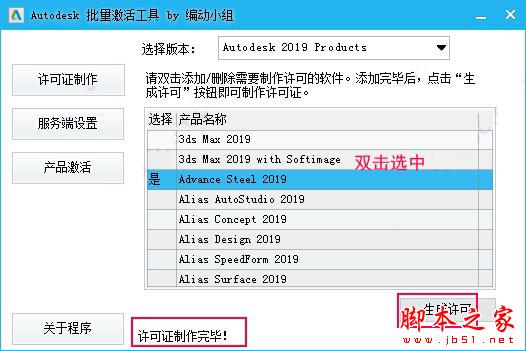 10、运行注册机即批量激活工具,勾选需要激活的软件包advance steel 2019,点“生成许可”;