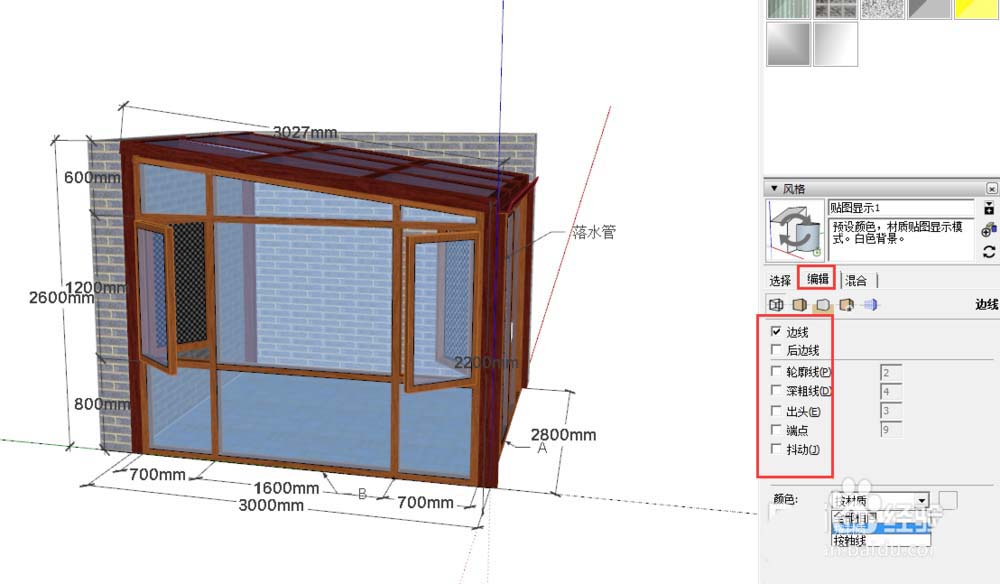 4、还可以对图形进行编辑 ,编辑它的边线类型及粗细的情况,以及颜色的情况。因此草图大师2017版本的风格选项框,就是旧版本的样式选项框