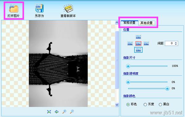 软件还有透明通道和波浪效果功能。图片倒影制作工具只需简单几步操作就可以为自己的图片添加倒影效果,完全傻瓜式操作。设置好后就可以保存图片了。
