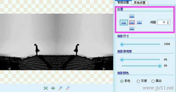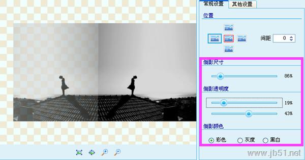 软件自动生成图片倒影,我们要做的就是设置倒影效果。首先调整倒影位置,可以选择上下左右和间距。接着选择倒影尺寸,透明度和颜色。