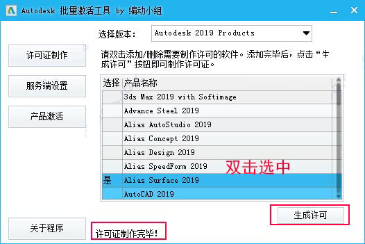 8、运行注册机即批量激活工具,勾选需要激活的软件包Alias Surface 2019,点“生成许可”;