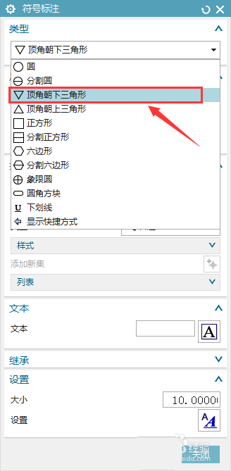 3、打开制图主页,找到注释,符号标注,选择顶角朝下三角形