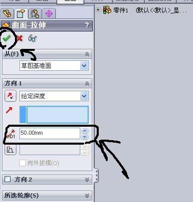4、点开拉伸曲面后弹出信息栏,根据需要填入拉伸尺寸。