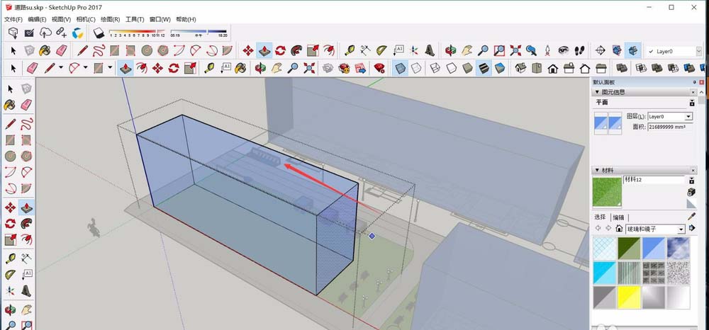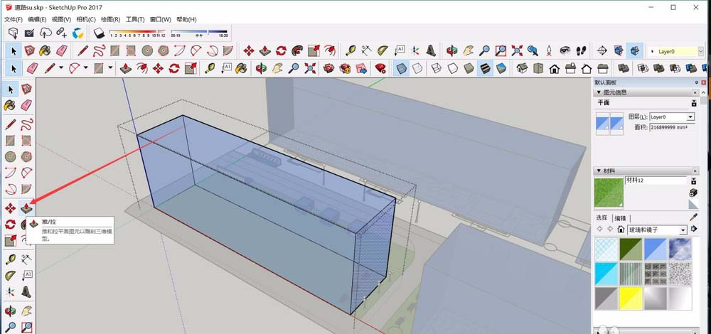 4、此时我们可以选中图块的某个单位,在Sketchup左侧工具栏中点击拖/拉工具,即可选中某一个面进行拖拽。