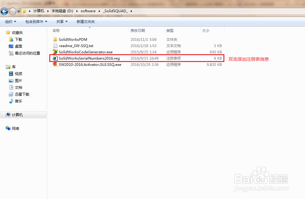 1、安装此软件一定要断网安装!!!下载完成后解压文件,打开破解文件夹,双击文件夹中的SolidWorksSerialNumbers2016.reg进行注册表注册,如下图。