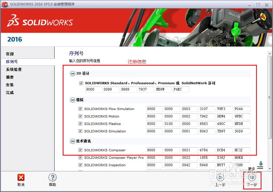 4、在序列号这一项,我们会发现序列号已经自动加载,点击“下一步”,继续安装。