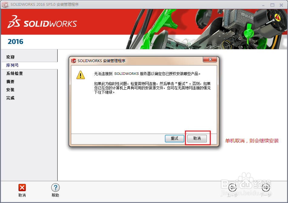 5、此时,安装界面会提示无法连接到SOLIDWORKS服务器,点击取消。