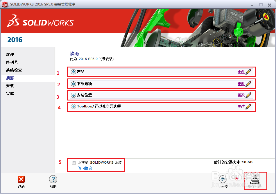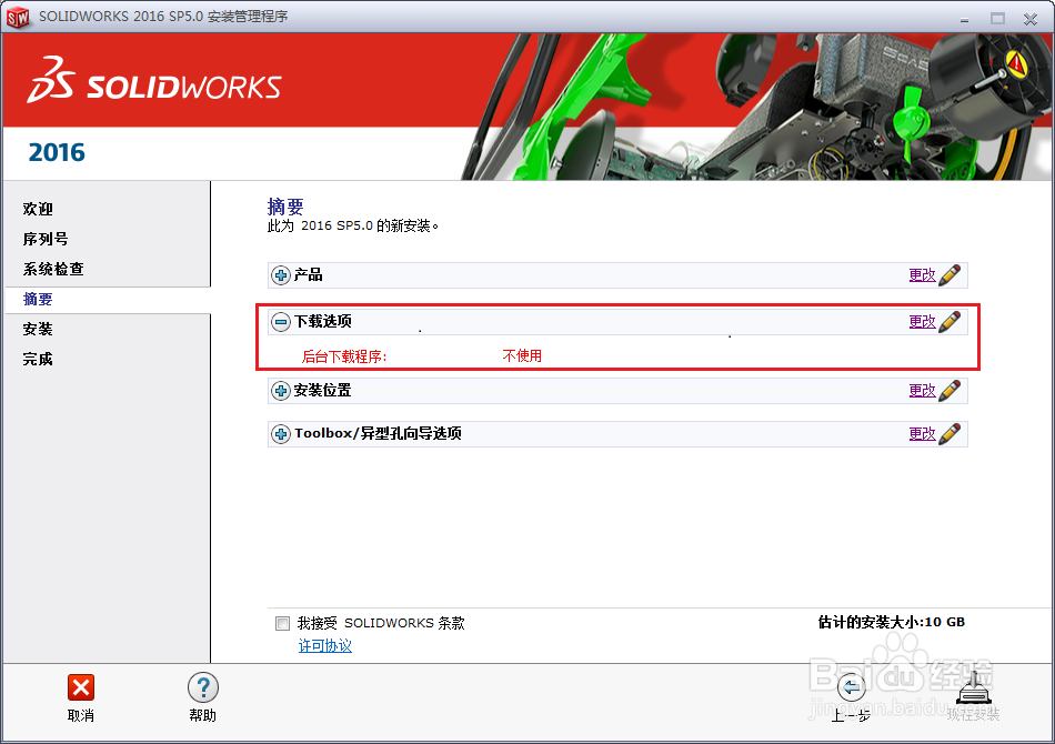 9、安装位置和Toolbox/异型孔向导选项路径可根据个人需求选择。勾上条款后,点击“现在安装”即可开始安装。安装过程大概半个小时左右。