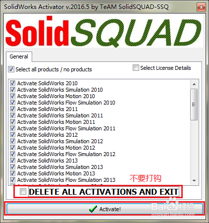1、经过上述步骤安装好软件后,打开破解文件夹中的“SW2010-2016.Activator.GUI.SSQ.exe”,去掉“DELETE ALL ACTIVATIONS AND EXIT”前面的钩,点击“Activate”,稍等片刻,会有提示,点击“OK”即破解完成。