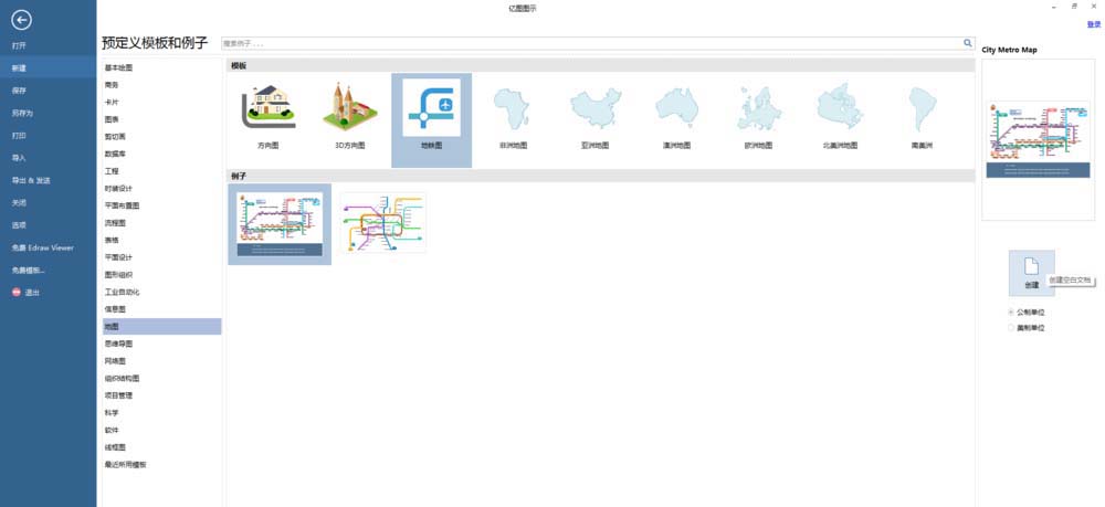 2、点击【地图】,在模板下点击【地铁图】,在例子下点击第一个模板例子,然后在右侧点击【创建】