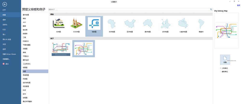 4、点击【地图】,在模板下点击【地铁图】,在例子下点击第二个模板例子,然后在右侧点击【创建】