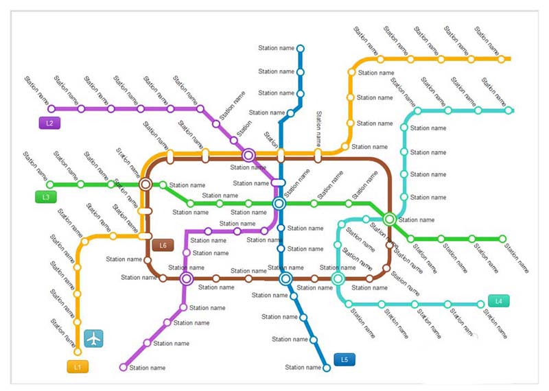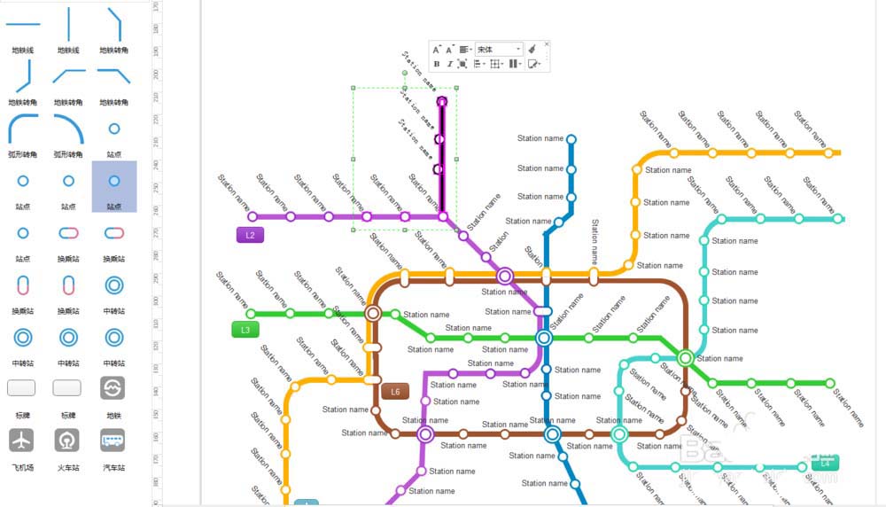 6、从左侧拖动对象到主窗口,添加更多的地铁图元素,以形成最终的地铁图