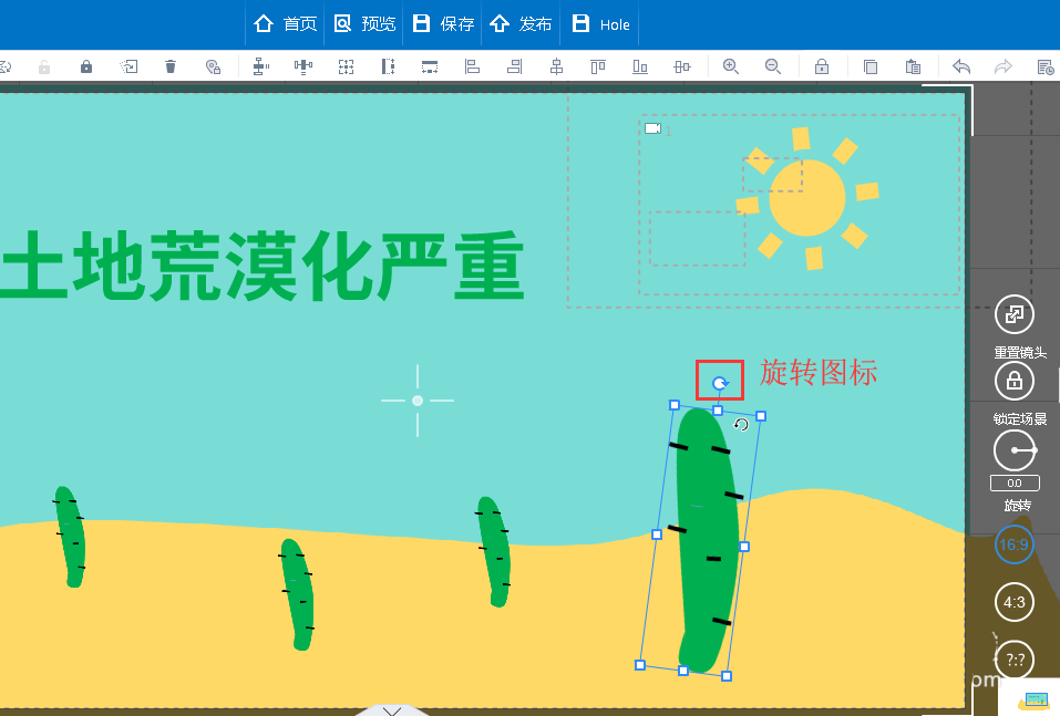1、选中元素对象—>旋转元素对象。选中元素对象,单击旋转图标,并长按鼠标左键进行旋转