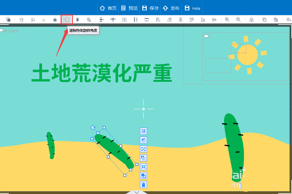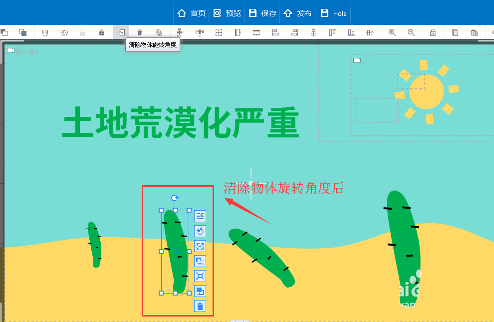 3、选中元素对象—>清除物体旋转角度。选中元素对象,点击画布上方的 “清除物体旋转角度” 图标按钮,便可清除。