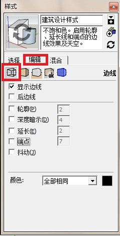 1、打开SU程序,然后打开线条样式编辑器:窗口——样式——编辑——左起第一个图标,面板中带“□”的选项就是需要调节的。