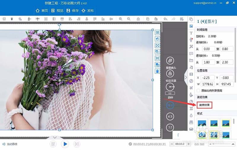 2、选择图片的装修效果;万彩动画大师提供丰富的装修效果,包括蒙版形状、前景、阴影和边框效果。自定义图片效果使图片更好地传递信息。