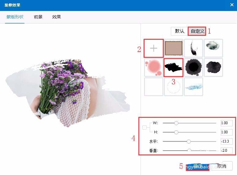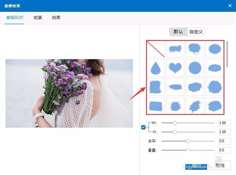 自定义->点击“+”按钮在新窗口中添加蒙版形状->选择蒙版->调整蒙版宽高、水平垂直->确定