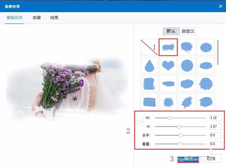 在“蒙版形状”选项中,点击选择任意一种蒙版形状,左侧图片可预览蒙版效果。在蒙版形状下方可调整图片的宽、高、水平和垂直,设置完毕后,点击“确认”保存设置。