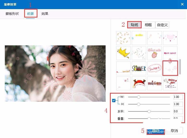 “前景”->“贴纸”->选择一种贴纸->调整贴纸的宽高、水平垂直效果->“确定”