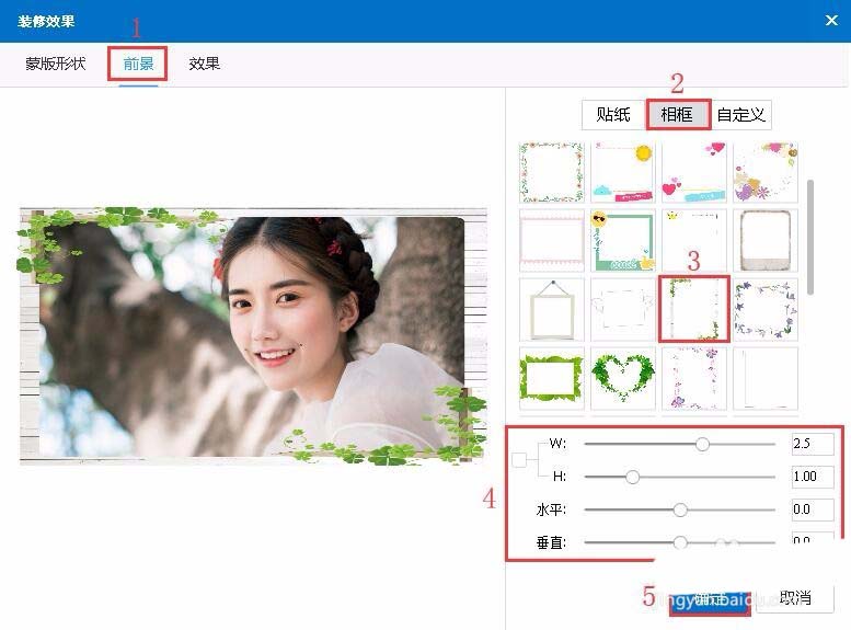“前景”->“相框”->选择一种相框效果->调整相框的宽高、水平/垂直->“确定”