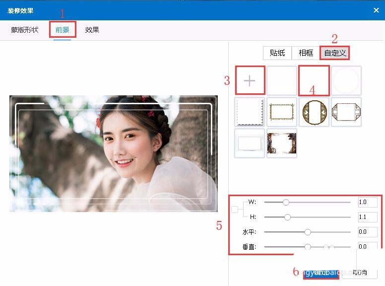 “前景”->自定义->点击“+”按钮在新窗口中添加相框->选择相框->调整相框宽高、水平垂直->“确定”