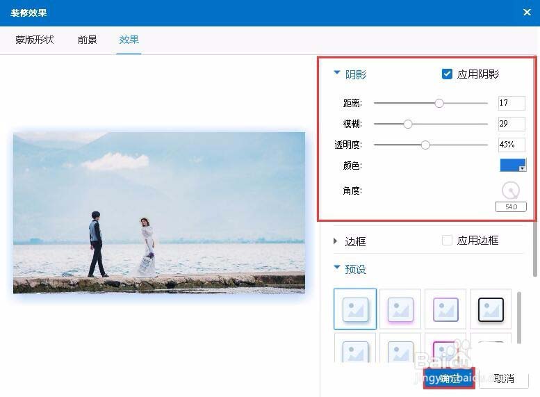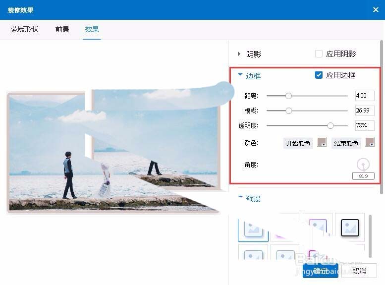 图片边框:自定义图片边框的距离、模糊、透明度、颜色和角度->确定
