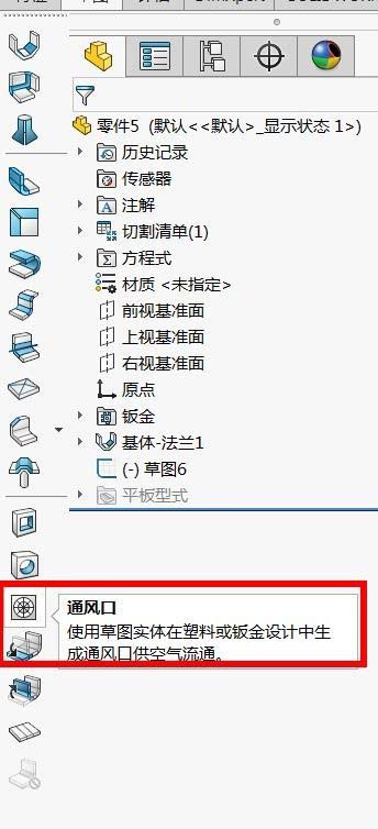 3、在钣金的工具栏中,找到通风口,选择这个命令