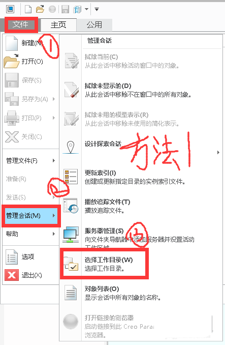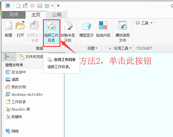 2、设置工作目录。单击“文件”→单击“管理会话(M)”→选择“选择工作目录(W)”命令(或单击主页选项卡中的““选择工作目录”按钮)。将工作目录设置至自己要的文件目录。