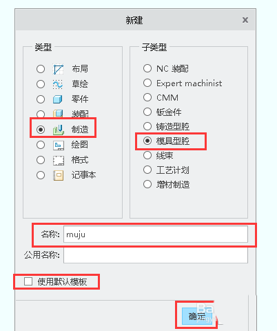 4、在“新建”对话框总的类型选中“制造”,在子类型选中”模具型腔“,在名称文本框中输入文件名,取消使用默认模板复选框中的“√”,然后单击对话框中的“确定”按钮。