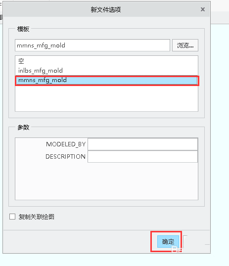 5、在弹出的“新文件选项”对话框,选中“mmns_mfg_mold”模板,单击”确定“按钮。