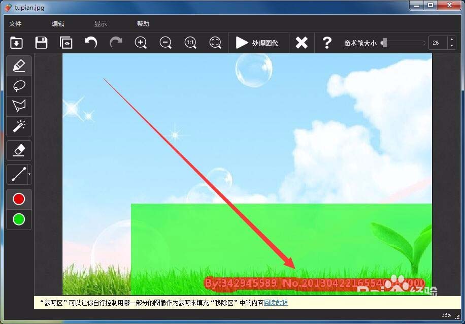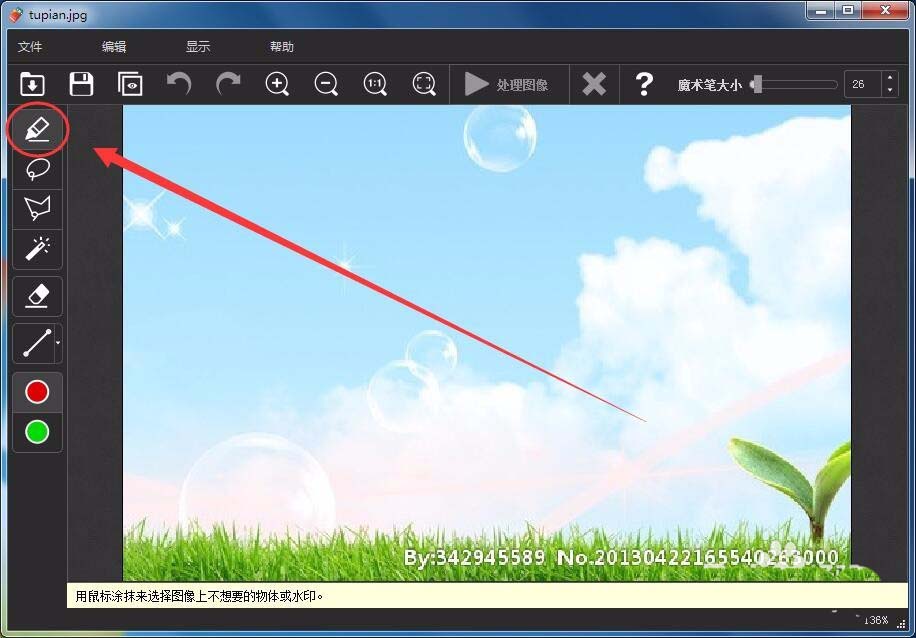 5、用魔术笔在水印上拖动,选择要去除的水印。