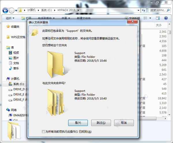 1.安装完成后先不要运行软件,回到刚才下载的数据包中将文件夹“patch”中的所有破解文件一起复制到软件的安装目录中“C:\HYPACK 2018\”,在出现的文件复制界面上点击“是”即可