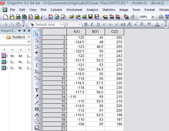 1、在origin9.1中,对于等值线图的要求有两种,一是彩色等值线图,黑白等值线图,灰度等值线图,剖面等值线图,极坐标等值线图,要求XYZ各一列数据,三角等值线图要求XY各一列,Z两列,本文以彩色等值线图为例子进行简单介绍,输入数据如下图: