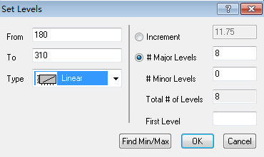 5、点击Colormap/Contour选项下面的level,弹出level设置对话框,可是设置level水平的最小值和最大值,设置水平的Type,在此将最小值设置为180,最大值设置为310,Type设置为线性的,设置完成后点击OK