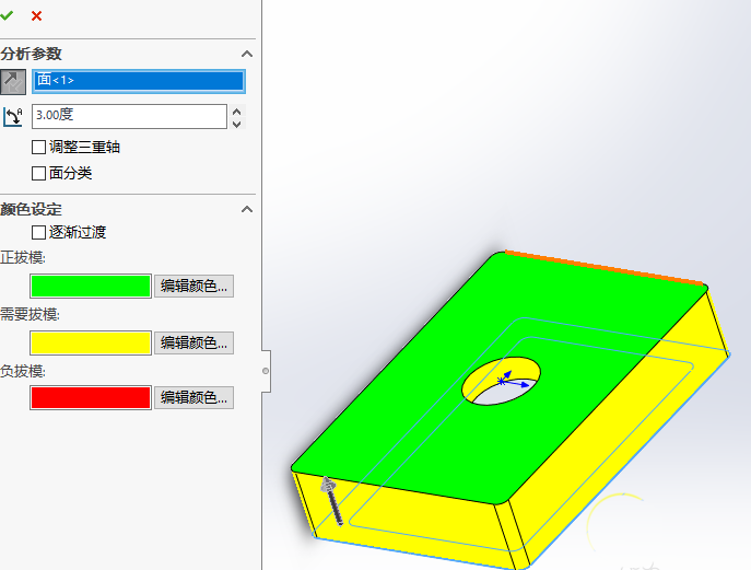 2、分析拔模:点选模具工具中的拔模分析,分析参数中第一栏选择底面(图中的红框),通过点击灰色箭头可以改变拔模方向。可以看出模型上有红、黄、绿三种颜色。拔模分析得到了红绿黄三色,红色为负拔模,将来与型芯接触;绿色为正拔模,将来与型腔接触;黄色则是需要添加拔模的面。我们希望外表面与型腔接触而内表面与型芯接触,所以需要添加拔模使外表面变为绿色而内表面变成红色。