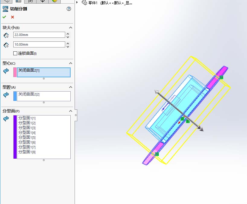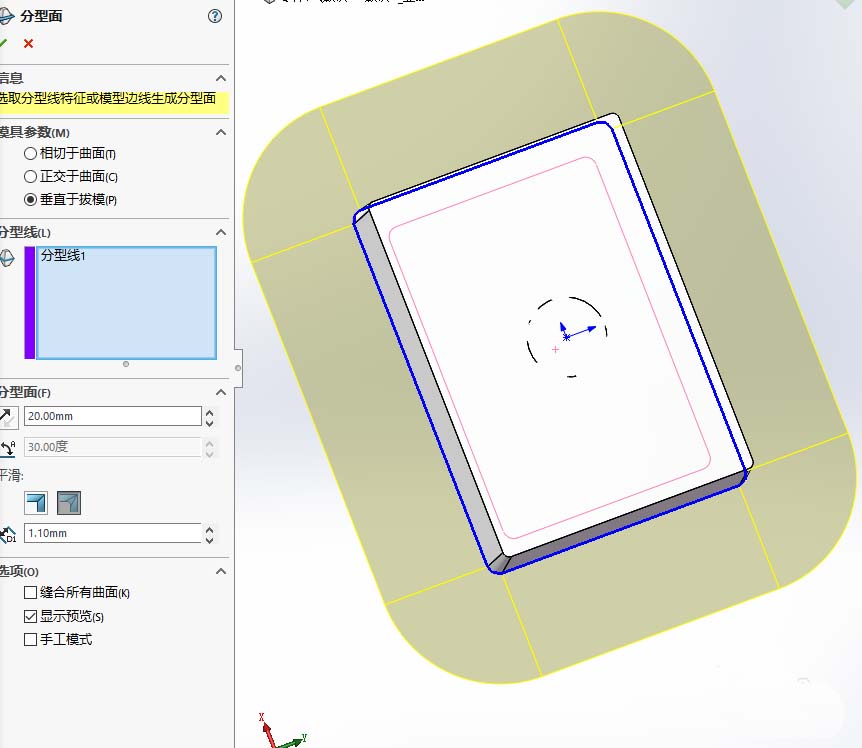 7、添加分型面:分型面即是将来模具从这个面上分离。操作:点开模具工具下面的“分型面”,分型线会自动选择之前设置的分型线,将分型面的长度数值改大一点。然后点√