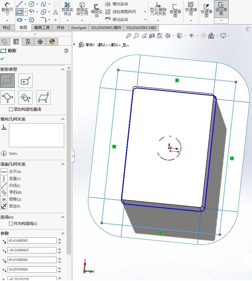 8、切削分割:通过前面的设置,已经可以生成型心和型腔了,使用“切削分割”完成这一工作。点击“切削分割”这时候系统提示选择(1)....(2)...意思是说需要一个草图用来生成模具,这时候我们只需要在图上点一下分型面,就会切换到草图模式。这时候需要在分型面上画一个矩形,注意:矩形不要超过分型面边界。矩形画好后,点√,点退出草图,就可以得到第三图。这时可以通过拖动灰色箭头来改变模具厚度。然后点√。