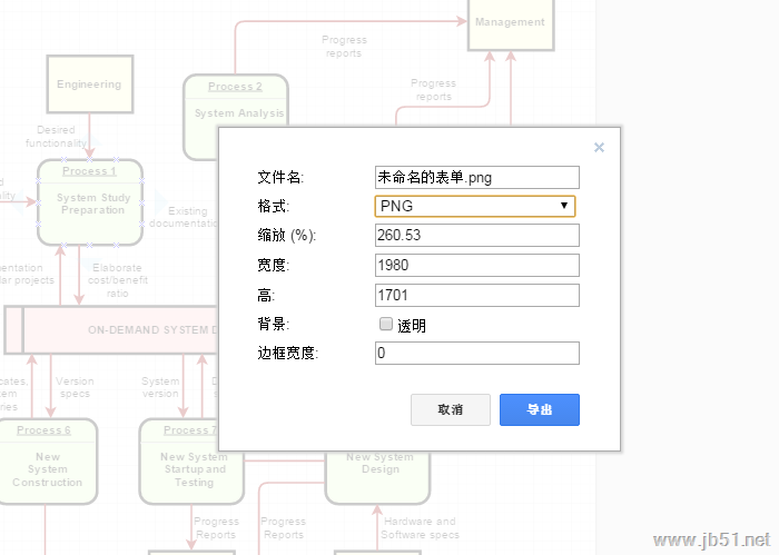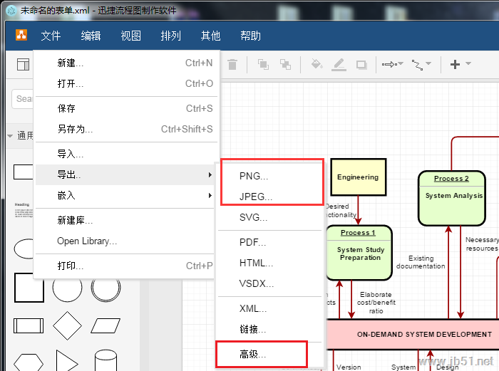 四、在打开已有流程图或是制作好流程图后,需要将流程图保存为图片文件,请选择“文件”-“导出”,然后根据需要选择PNG或JPEG格式进行保存。