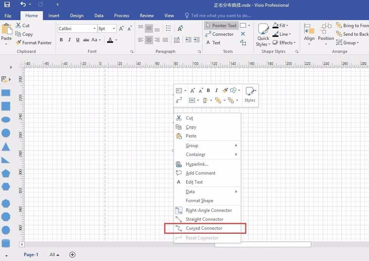5、在得到的直角连接线上右击,选择“Curved Connector(曲线连接线)”,将两点之间的连线转换为曲线连接