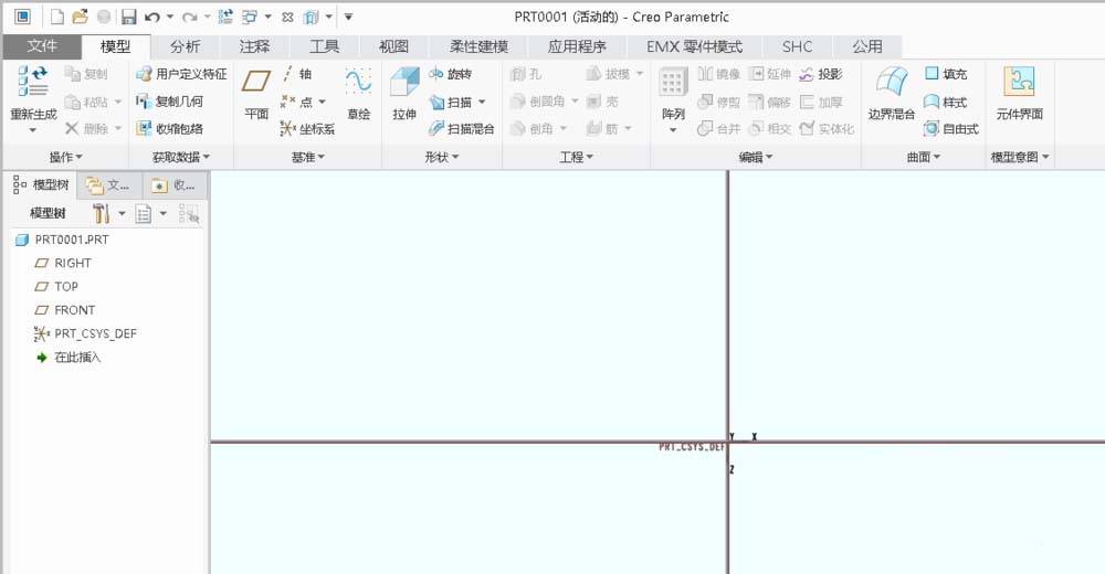 3、单击“模型”功能选项卡中的“基准”区域中的“草绘”进入草绘环境。,