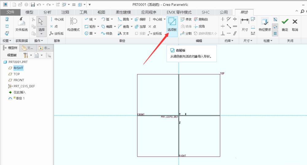 4、在“草绘”操控板中,单击“草绘"区域中的”选项板“。弹出”草绘器选项板“对话框。