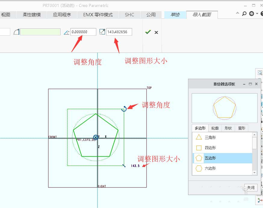 5、选中”草绘器选项板“对话框中的”五角星图形“然后移动到草绘图形区自己要放置的地方。弹出”导入截面“操控板。