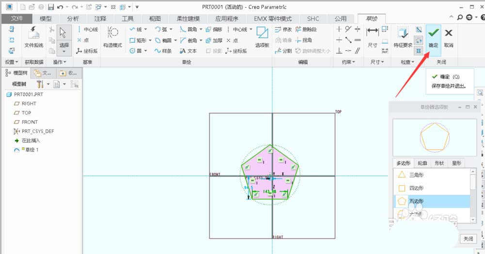 8、单击”草绘“功能区”确定“按钮。完成五角星的草绘。