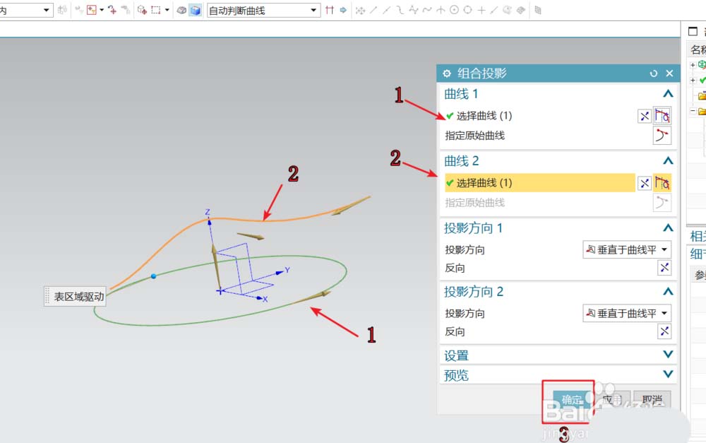 3、在建模工作区中,选用组合投影命令。按图所示的进行曲线选取,确定后得到组合投影的曲线。将不用的草图隐藏。