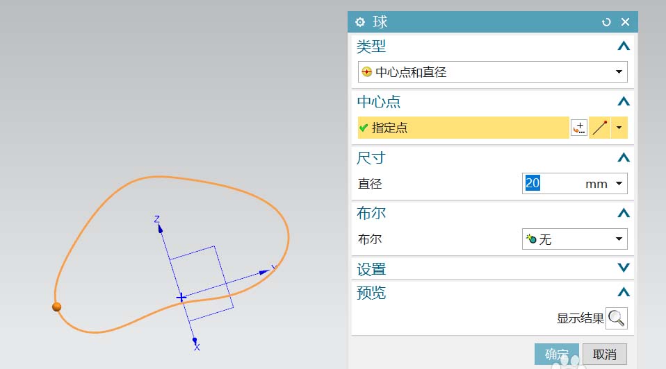 4、以中心点和直径的类型创建一个圆球,直径为20;中心点选取组合曲线的点。