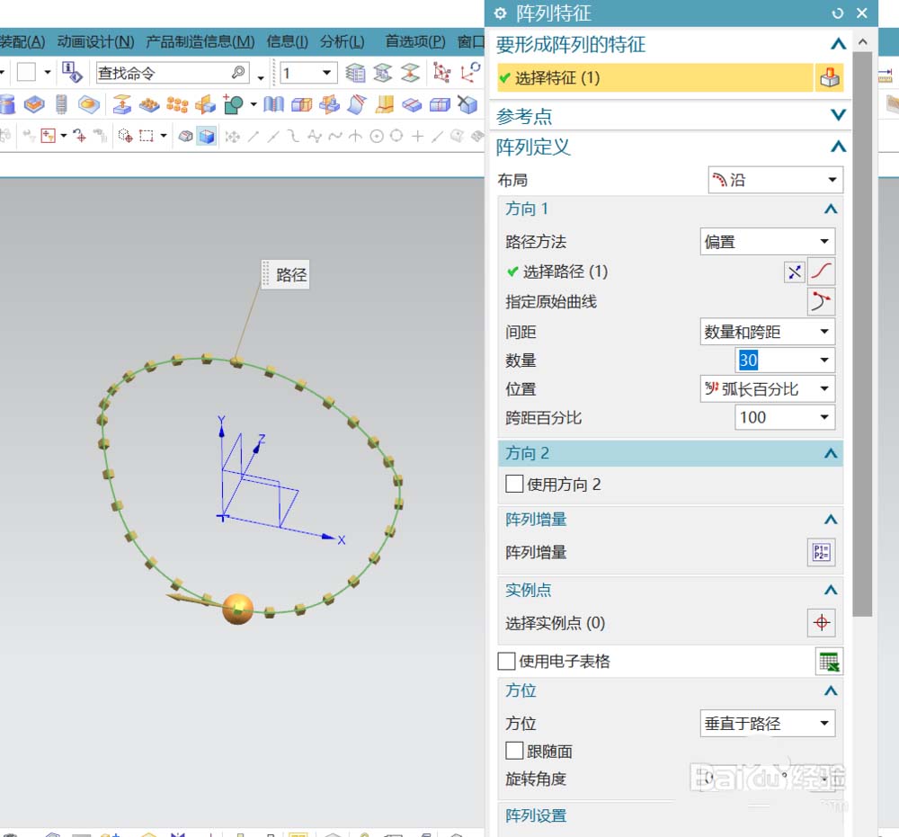5、给圆球添加沿路径阵列,阵列个数为30,跨距为100%弧长。得到按曲线形状阵列的珠子。