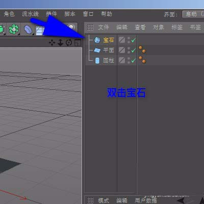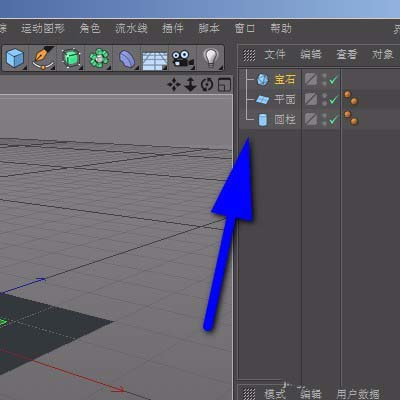 1、比如,创建了一个圆柱体;一个宝石物体和一个地面;创建后,在对象管理器中自动显示着默认的名称。